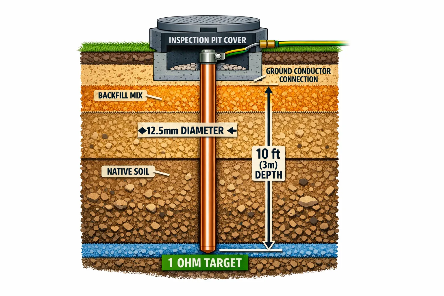 - আর্থ ইলেকট্রোড: মাটির নিচে থাকা আর্থিং এর রডটি (ইলেকট্রোড) অন্তত ১০ ফিট লম্বা হতে হবে এবং এর ডায়ামিটার হবে ১২.৫ বা ১২.৭ মিলিমিটার।